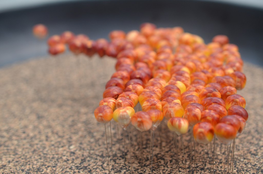 Alejada momentáneamente de las angustias por las amenazas a la existencia de estas variedades de maíz nativas de la región cundiboyacense y del campesinado colombiano, causados por las políticas de monocultivo y la industria alimentaria, el ejercicio invita a disfrutar la diversidad de formas y colores, la enorme belleza de la “imperfección”, es decir, de aquellas semillas que no son homogéneas y regulares, como se requiere en los procesos industrials. En resumen la variabilidad que permite crear la vida en la tierra.