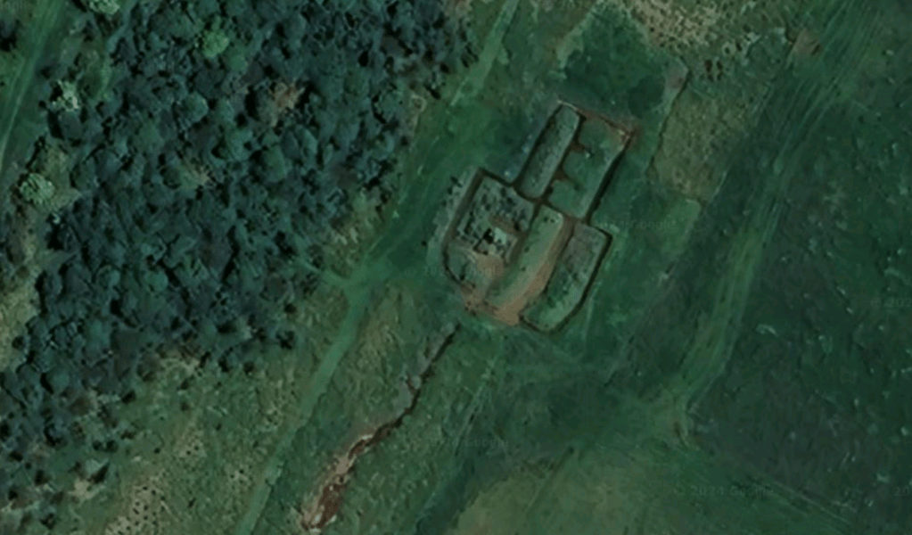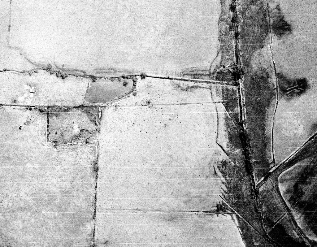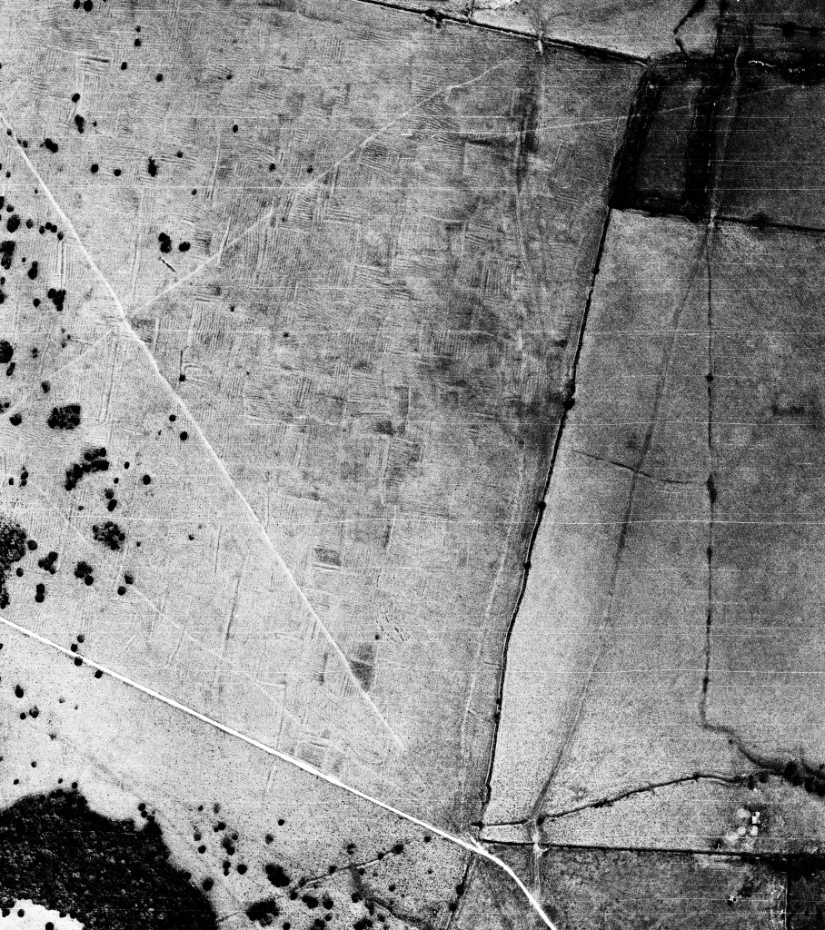 Evidencia de huellas de los antiguos camellones en damero, Hacienda Las Mercedes, Suba, cerca al Humedal. Detalle de aerofotografía IGAC, vuelo C773-129, realizado en 1956.