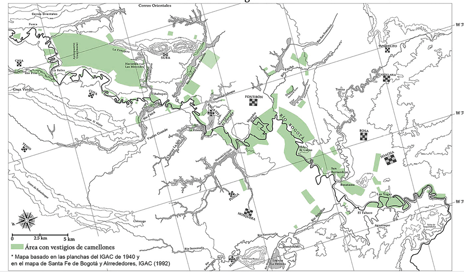Con las características geológicas de esta Sabana de Bogotá -o, realmente, valle del Bogotá- una antigua laguna, siempre dispuesta a la inundación y con zonas que conservan todo el año un alto nivel freático, trabajaron los habitantes de la Sabana, del periodo Herrera a los Muiscas, para hacer un sistema de zanjas y camellones que se extiende en toda la planicie aluvial. En un lapso que se calcula de 2000 a 3000 años, levantaron una red de zanjas y camellones que va de Guaymaral a Soacha, sistema que permitía dirigir la inundación, mantener la cría de peces y animales de agua, y sembrar en las áreas anegadas.