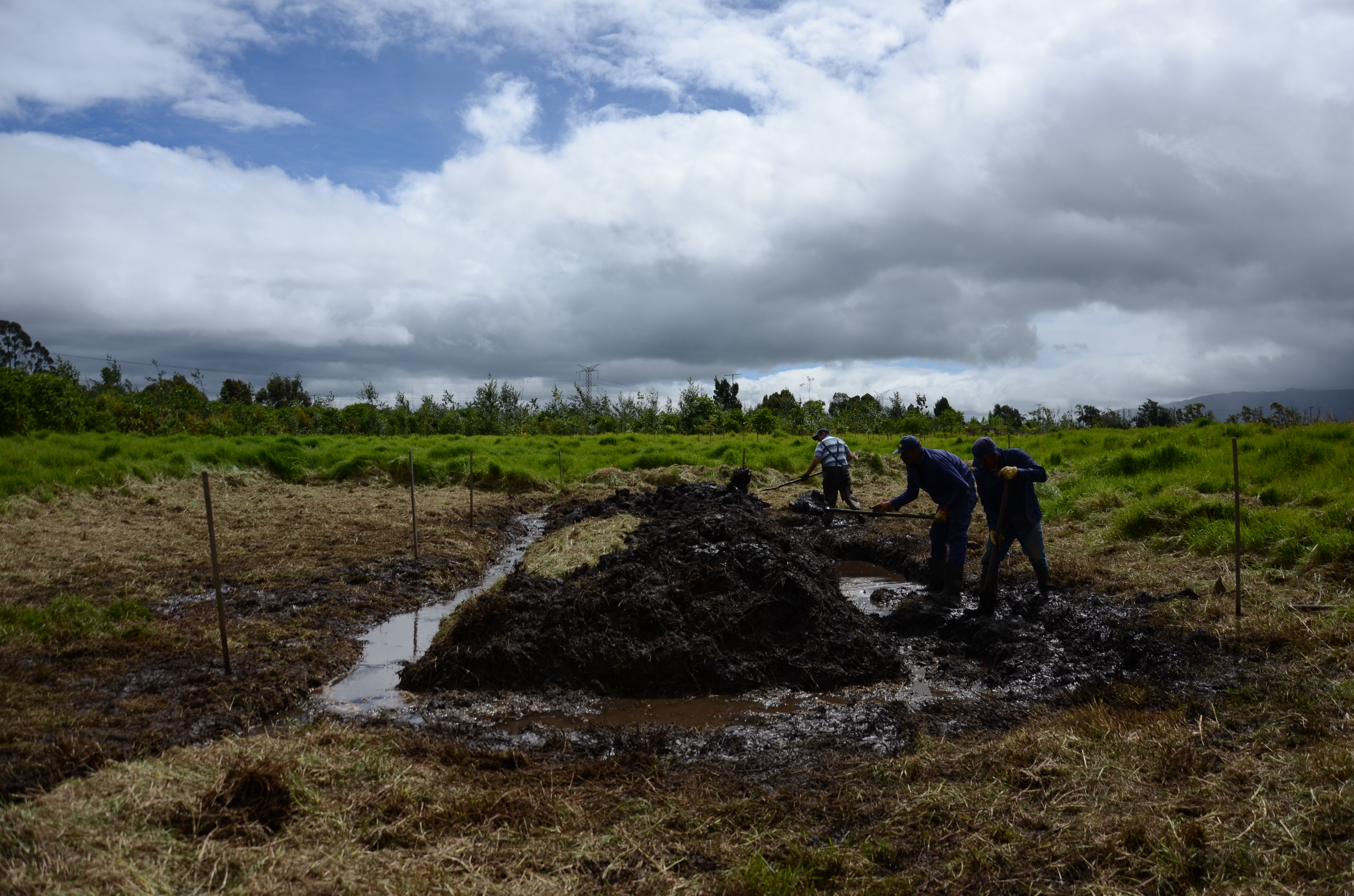 En este tiempo de sequía los canales de agua lluvia se secan, es el momento de recoger los lodos de las zanjas y ponerlos sobre los camellones para fertilizar. Actualmente las zanjas y camellones, como todo el complejo del bosque Las Mercedes, están bajo el cuidado del Jardín Botánico den Bogotá.